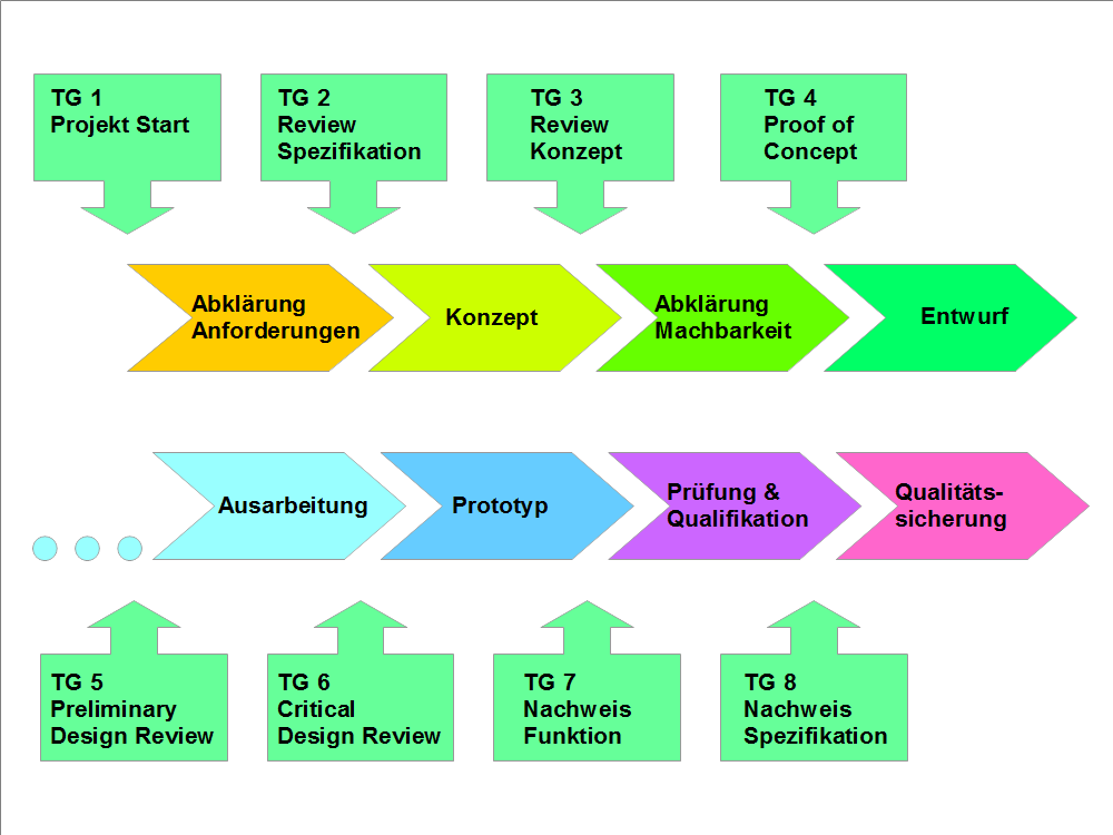 Beispiel eines Projektablaufmodelles, je nach Anforderungen wird dieses angepasst