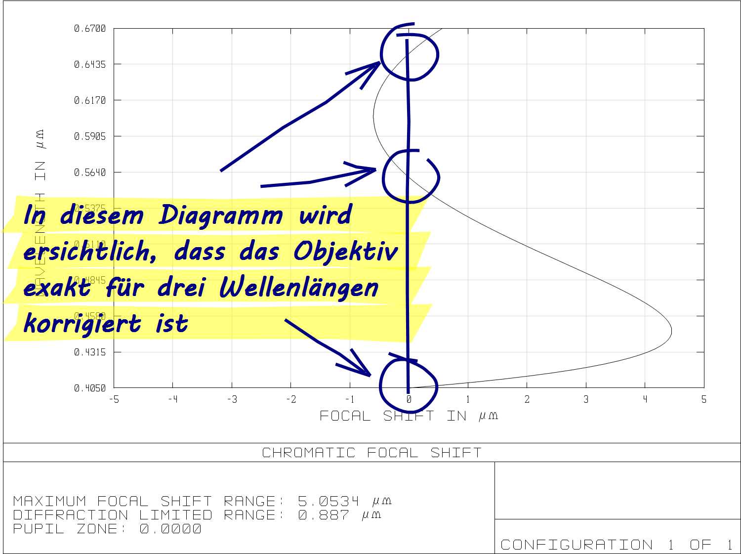 Mitte: Das Chromatic-Focal-Shift-Diagramm zeigt die